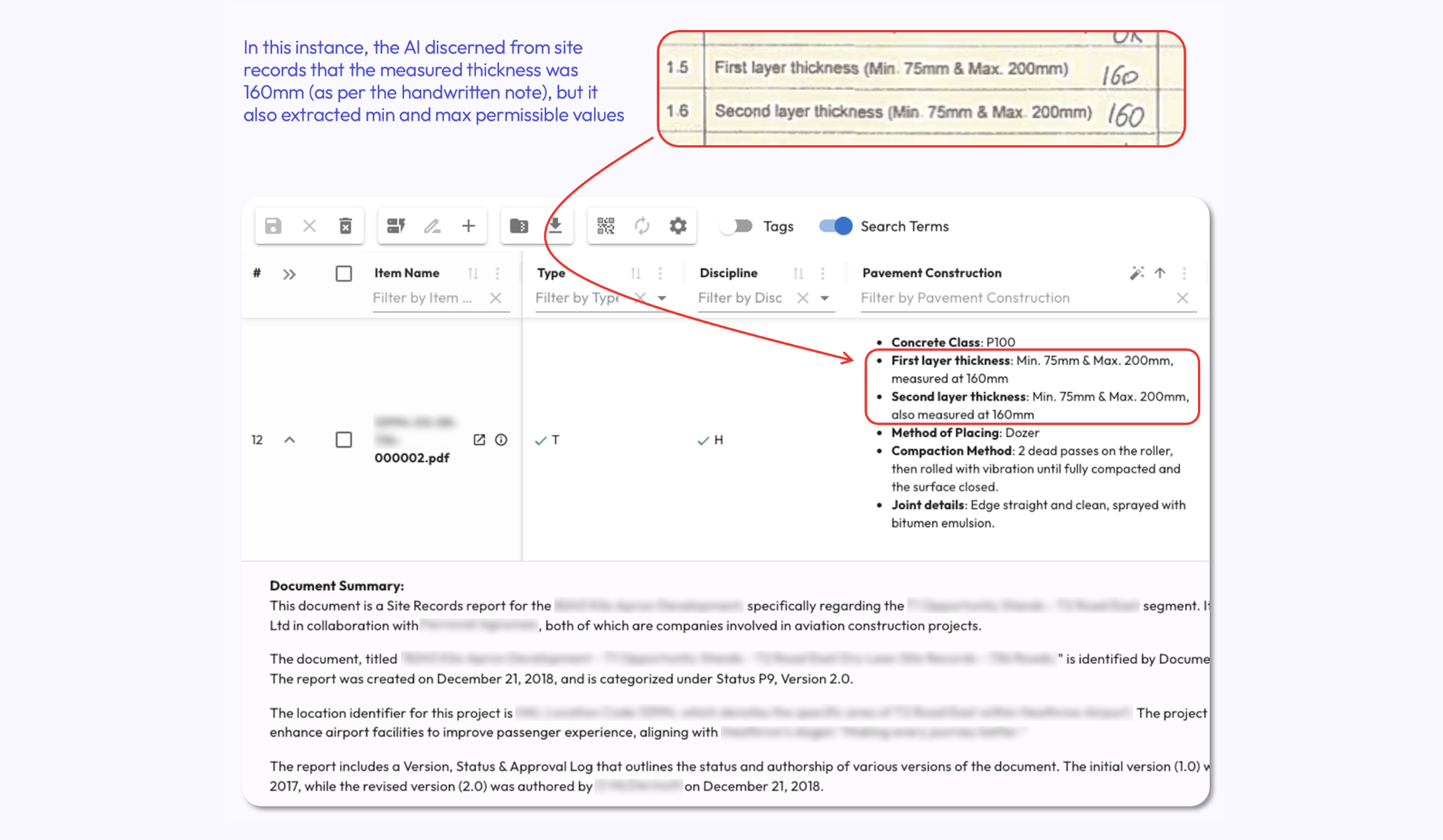 - Automated extraction and summarisation: When relevant information was found, Hoppa automatically extracted and summarised it - across diverse sources including scanned handwritten site logs and technical drawings.