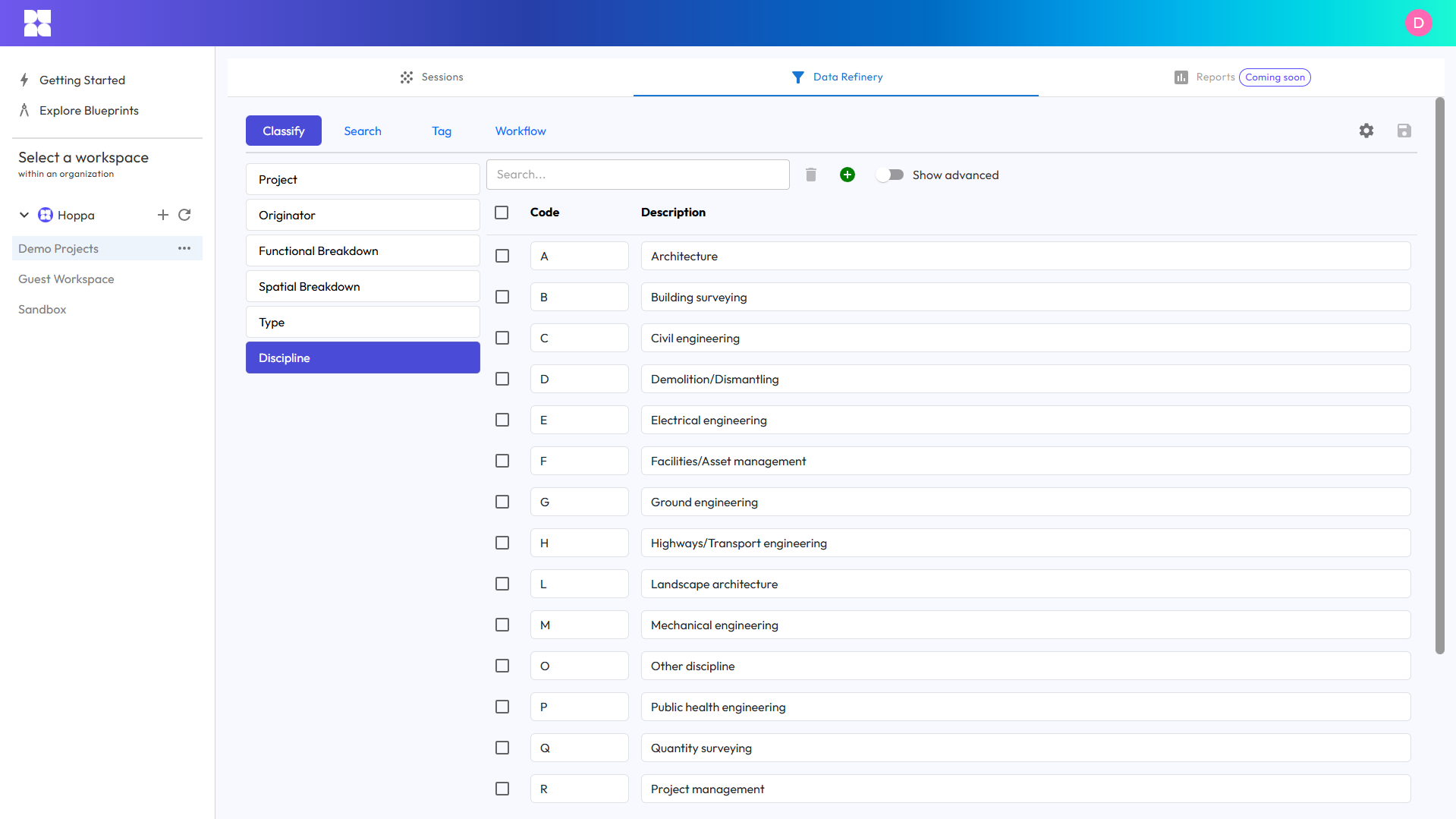 The ISO 19650 series of standards defines a set of categorical metadata fields - including Functional Breakdown, Spatial Breakdown and Type - that can form a basis for your metadata specification. Hoppa comes pre-loaded with the ISO 19650 UK National Annex and other variants of the specification published by UK public sector bodies.